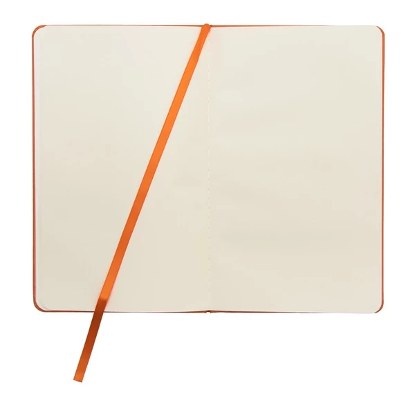 Notatnik w twardej oprawie z elastyczną gumką chroniącą wnętrze. Papier kremowy chamois w kratkę. Tasiemka do zaznaczanie ostatniej zapisanej strony.