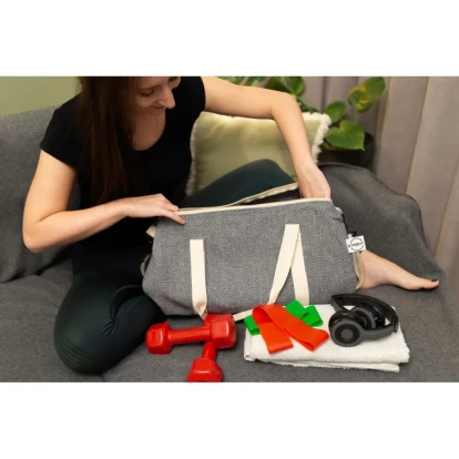 Torba sportowa, podróżna wykonana z bawełny z recyklingu i poliestru z recyklingu, posiada certyfikat GRS (Global RecycIed Standard), duża przegroda główna na zamek błyskawiczny, uchwyty i regulowany pasek na ramię
